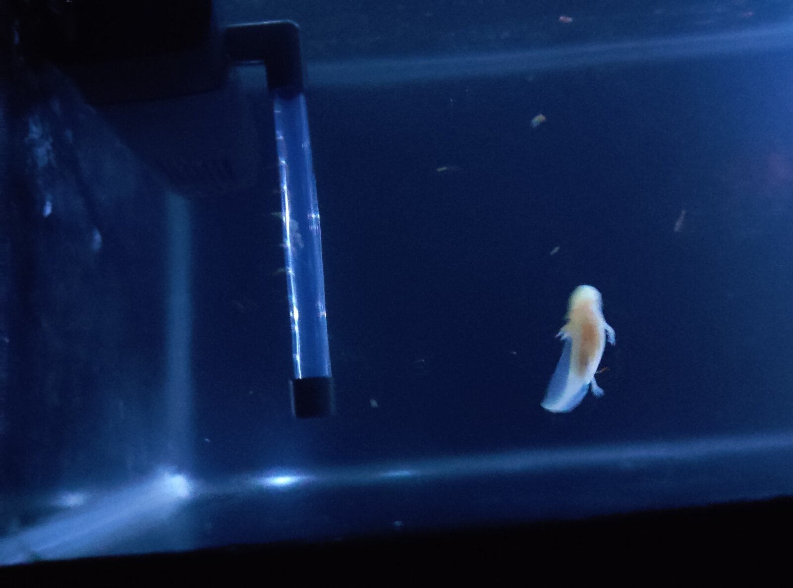 | Urgente Mi ajolote está enfermo Buenas noches . Hace una semana me regalaron ajolote . Le adecue su pecera, con airador. Plantas filtro piedritas . Lo alimento con poca Artemias a diario.pero hoy lo ví nadar de costado y flotando durante el día . Pero la última vez que lo ví está flotando panza arriba . Me puse a investigar y leí en este foro problemas similares a los de mi ajolote, le he sacado de la pecera y puesto en un tupper con poca agua para que no flote y se ponga panza arriba . Que más puedo hacer ya que mi ajolote es bebe? | |
