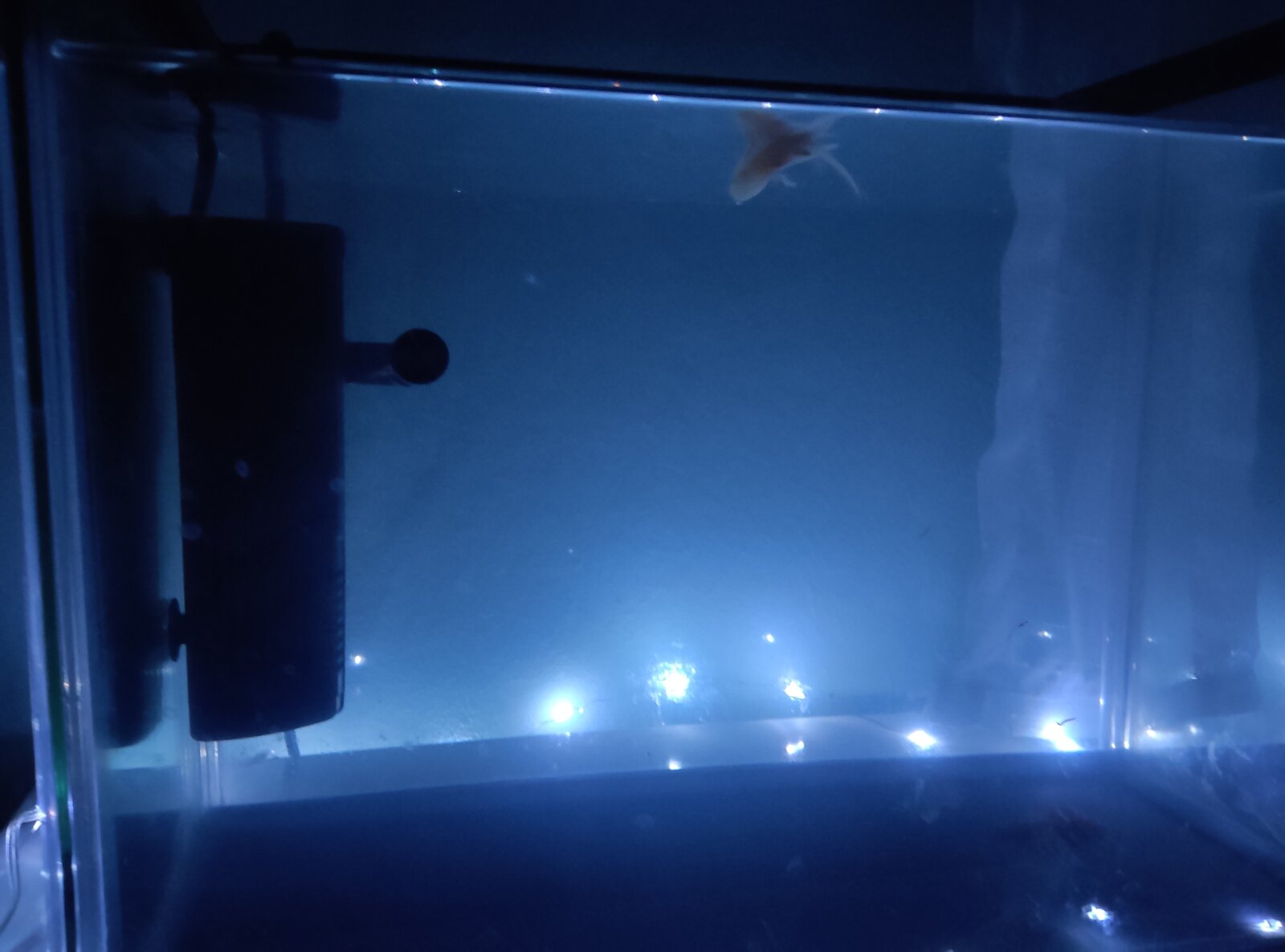 | Urgente Mi ajolote esta enroscado sobre si mismo y flota de la cola *- ¿Cuál es la medida de la base de tu acuario? (largo x ancho), ¿de cuántos litros consta?:40 Litros y su base mide 60x31cm*- ¿Cuáles son los parámetros del agua?- Temperatura: 17 - Dureza:>21° dGH - Amonio: desconocido - Nitritos: 0mg/l - Nitratos: 0mg/l*- ¿Qué filtración tiene?- Tipo de filtro (cascada, interno, externo): Cascada - Potencia del filtro (litros por hora): 567 L/h - Materiales filtrantes (esponjas, carbón activado, material biológico): Esponja y canutillos de ceramica - Modelo del filtro: Aquaclear 30*- ¿Cada cuánto haces cambios de agua, y en qué cantidad?:Cada 2 dias 20%*- ¿Usas algún tipo de químico en el agua? como por ejemplo anticloro o acondicionadores:NO*- ¿Tiene iluminación el acuario? (explica cómo es, qué potencia tiene):NO*- ¿El Axolote vive solo o acompañado por otro/s?, (tiene otros compañeros como caracoles, peces, etc):... | |